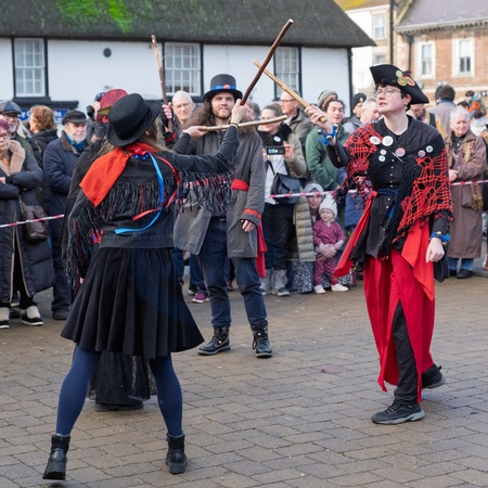 Morris dancers at Whittlesea straw bear festival,held every January in the little town of Whittlesey / Whittlesea in Cambridgeshire, near Peterborough, UK. Here a straw bear parades and dances through the streets along with various Molly / Morris dancers.