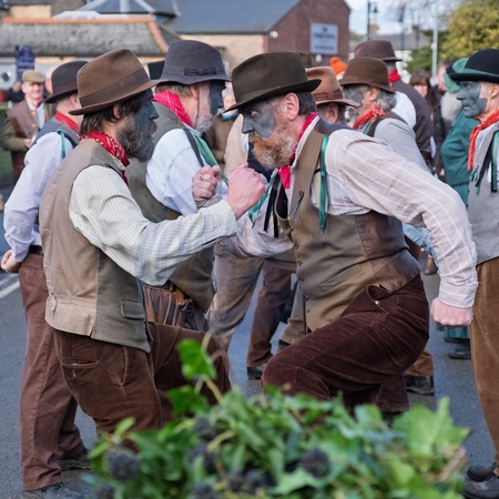 "Old Glory" morris dancers perform at Whittlesea straw bear festival,held every January in the little town of Whittlesey / Whittlesea in Cambridgeshire, near Peterborough, UK. Here a straw bear parades and dances through the streets along with various Mo