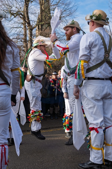 White rose morris dancers perform at Whittlesea straw bear festival,held every January in the little town of Whittlesey / Whittlesea in Cambridgeshire, near Peterborough, UK. Here a straw bear parades and dances through the streets along with various Moll