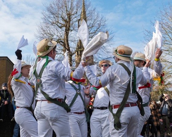 White rose morris dancers perform at Whittlesea straw bear festival,held every January in the little town of Whittlesey / Whittlesea in Cambridgeshire, near Peterborough, UK. Here a straw bear parades and dances through the streets along with various Moll