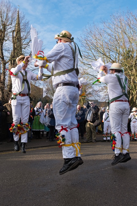 White rose morris dancers perform at Whittlesea straw bear festival,held every January in the little town of Whittlesey / Whittlesea in Cambridgeshire, near Peterborough, UK. Here a straw bear parades and dances through the streets along with various Mol