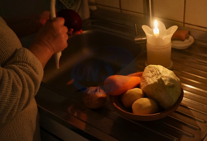 A woman peels vegetables by candlelight in Kharkiv, Ukraine, on January 17, 2026. Emergency electricity outage schedules were applied in some districts of the city to stabilize the energy grid following new Russian shelling of energy infrastructure, Credit:Viacheslav Madiievskyi / Avalon