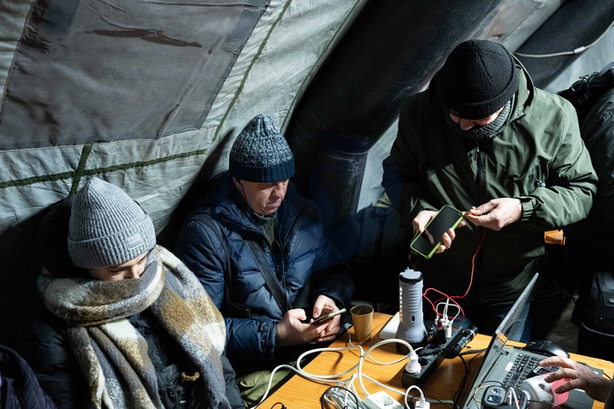 Kyiv residents charge their phones and drink hot beverages at a mobile Point of Invincibility operated by the State Emergency Service of Ukraine and deployed in the Rusanivka residential area due to power and heating outages following another wave of mass attacks by Russia on the energy system of Ukraine, Kyiv, Ukraine, on January 18, 2026, Credit:Danylo Antoniuk / Avalon