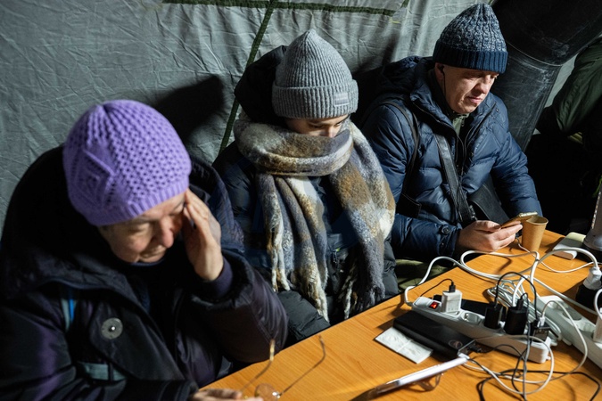 Kyiv residents charge their phones and drink hot beverages at a mobile Point of Invincibility operated by the State Emergency Service of Ukraine and deployed in the Rusanivka residential area due to power and heating outages following another wave of mass attacks by Russia on the energy system of Ukraine, Kyiv, Ukraine, on January 18, 2026, Credit:Danylo Antoniuk / Avalon