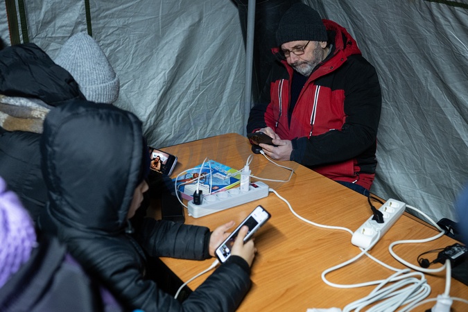 Kyiv residents charge their phones, lamps and flashlights at a mobile Point of Invincibility operated by the State Emergency Service of Ukraine and deployed in the Rusanivka residential area due to power and heating outages following another wave of mass attacks by Russia on the energy system of Ukraine, Kyiv, Ukraine, on January 18, 2026, Credit:Danylo Antoniuk / Avalon