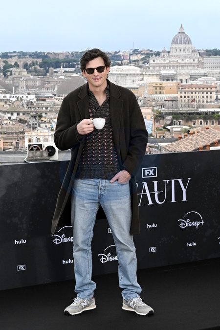 January 19, 2026, Rome. Presentation of The Beauty, the new international thriller television series from FX, from executive producer Ryan Murphy, starting January 22 on Disney+. Pictured: Ashton Kutcher with a cup of cappuccino against the backdrop of the Dome of St. Peter's Basilica., Credit:Maria Laura Antonelli / Avalon