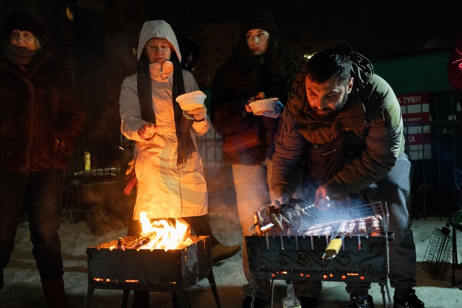 Kyiv residents warm up and cook foodon open flames amid blackouts