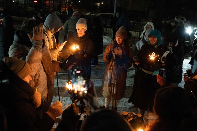 Residents of an apartment building in the Pozniaky neighborhood light sparklers to keep warm in the courtyard during prolonged power outages and heating disruptions caused by Russian missile and drone attacks on the energy system of Ukraine, Kyiv, Ukraine, on January 18, 2026, Credit:Danylo Antoniuk / Avalon