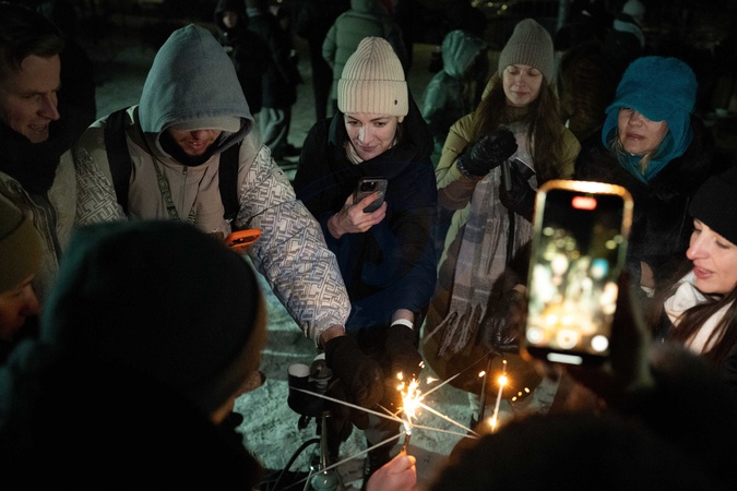 Residents of an apartment building in the Pozniaky neighborhood light sparklers to keep warm in the courtyard during prolonged power outages and heating disruptions caused by Russian missile and drone attacks on the energy system of Ukraine, Kyiv, Ukraine, on January 18, 2026, Credit:Danylo Antoniuk / Avalon