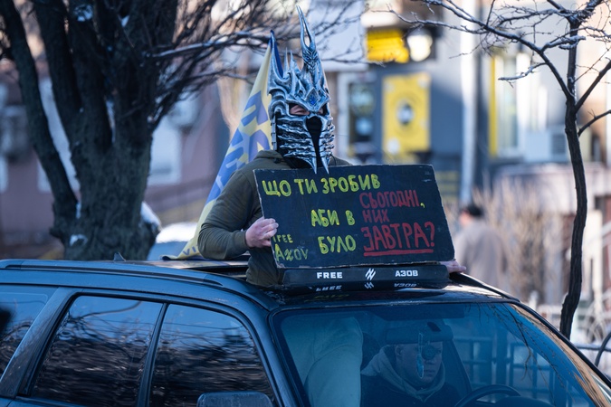 A man wearing a fantasy helmet looks out of a vehicle hatch holding a placard during a weekly reminder rally in support of prisoners of war from the Mariupol garrison, all prisoners of war and missing defenders of Ukraine, titled "Don't Be Silent! Captivity Kills,” held outside the Dorohozhychi metro station, Kyiv, Ukraine, on January 18, 2026, Credit:Danylo Antoniuk / Avalon