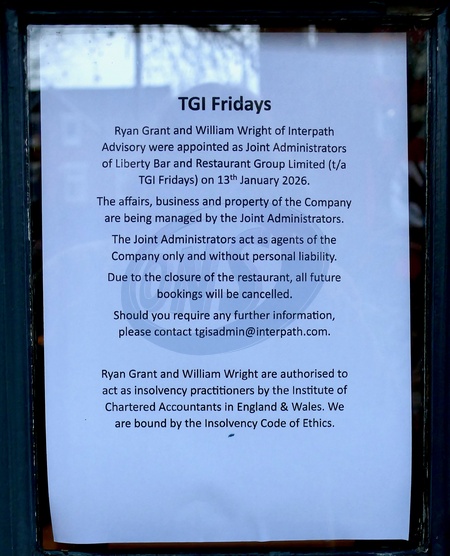 The Reading T.G.I Fridays which has now closed. Popular UK restaurant chain collapses into administration and shuts 14 sites. Liberty Bar and Restaurant Group, which runs TGI Friday's UK operations, filed a notice of its intent to appoint administrators days before Christmas. Earlier in December, the business had filed an administration notice. It has now been confirmed that 16 restaurants across the UK have been closed, impacting around 456 workers. 14 are in England, with two sites in Scotland, Credit:Geoffrey Swaine / Avalon