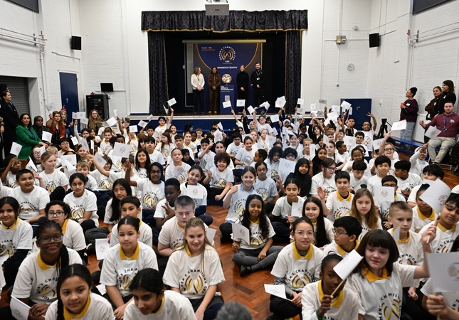 BRENTFORD, ENGLAND - JANUARY 19: Alex Scott and Jill Ellis pose with the trophy and pupils during the FIFA Women's Champions Cup Trophy reveal at Lionel Primary School on January 19, 2026 in Brentford, England. *** Local Caption ***, Credit:TJ / XX / Avalon