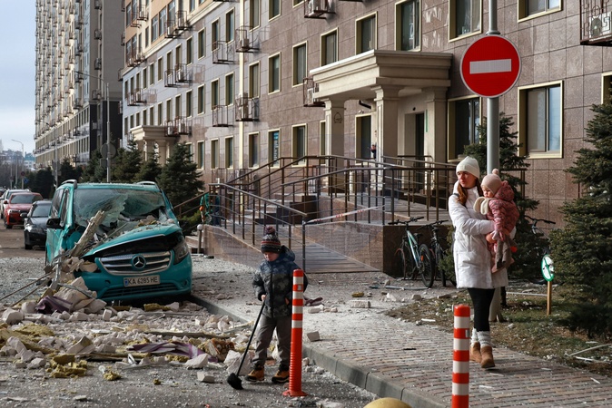 A woman and a child walk along a sidewalk strewn with glass and debris after a Russian drone hit a 25-storey residential building in Odesa, Ukraine, on January 19, 2026, Credit:Nina Liashonok / Avalon