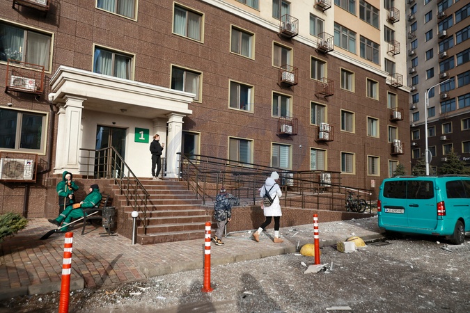 A woman and a child walk along a sidewalk strewn with glass and debris after a Russian drone hit a 25-storey residential building in Odesa, Ukraine, on January 19, 2026, Credit:Nina Liashonok / Avalon