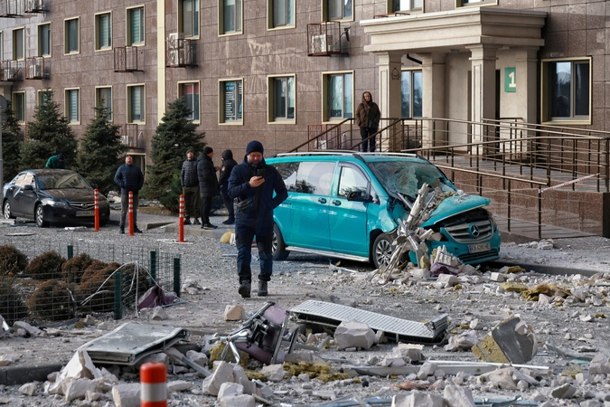 Residents of a multi-storey residential building damaged by a Russian drone attack take photos with their phones of a courtyard strewn with glass and stones in Odesa, Ukraine, on January 19, 2026, Credit:Nina Liashonok / Avalon