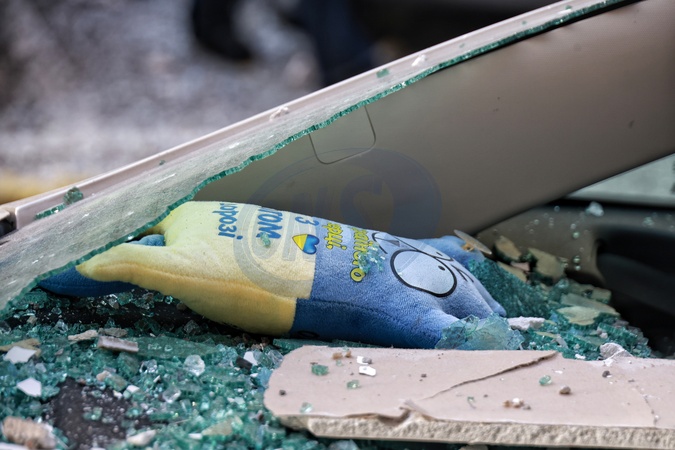 A decorative cat-shaped pillow bearing the inscription "With Ukraine in the heart, with a friend on the road” lies among shattered glass inside a car damaged by a Russian drone attack in Odesa, Ukraine, on January 19, 2026, Credit:Nina Liashonok / Avalon