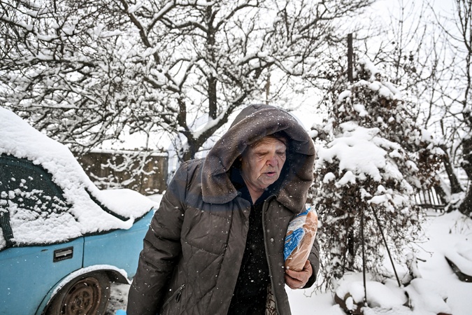 A woman carries bread from a food package delivered by law enforcement officers who arrived on a humanitarian mission to a frontline settlement near Huliaipole, Zaporizhzhia region, on January 16, 2026. Due to deadly risks and the proximity of the front line, police are solely responsible for humanitarian assistance in the area, including food deliveries, evacuations, and feeding abandoned animals in villages emptied by fighting, Credit:Dmytro Smolienko / Avalon