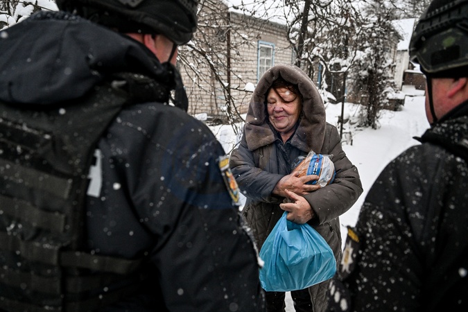Police officers deliver food supplies and hygiene items to civilians in one of the frontline settlements near Huliaipole, Zaporizhzhia region, on January 16, 2026. Because of constant shelling threats and the closeness of the front line, only police are able to deliver humanitarian aid in the area. Officers also evacuate residents to safer locations and provide food and water to those living alone, as well as feed abandoned animals in empty villages, Credit:Dmytro Smolienko / Avalon
