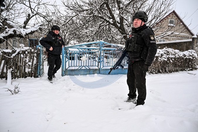 Police officers go door to door to speak with residents about evacuation to safer locations in a frontline settlement near Huliaipole, Zaporizhzhia region, on January 16, 2026. In the area, only police are able to deliver humanitarian aid because of extreme danger and the closeness of hostilities, while also supplying bread and water, evacuating civilians, and feeding abandoned animals in empty villages, Credit:Dmytro Smolienko / Avalon