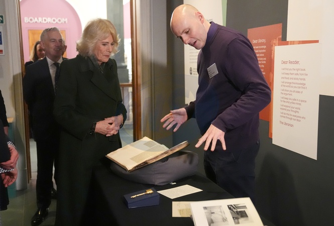 Queen Camilla is shown artefacts by Ralph McLean, including a ceremonal key used to open the building in 1956 during a visit to National Library of Scotland, Edinburgh, to mark the launch of the National Year of Reading in Scotland, led by the Department for Education and the National Literacy Trust. Picture date: Monday January 19, 2026., Credit:Andrew Milligan / Avalon