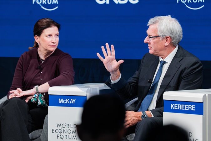 Bettina Orlopp, Chief Executive Officer, Commerzbank, Germany; David McKay, President and Chief Executive Officer, RBC (Royal Bank of Canada), Canada during Banking Accelerated session at the World Economic Forum Annual Meeting 2026 in Davos-Klosters, Switzerland, on 20/1/2026 from 08:15 to 09:00 in the Congress Centre – Aspen 2 (Zone E), Stakeholder Dialogue. (future banking). 2026 World Economic Forum / Jakob Polacsek, Credit:World Economic Forum / Avalon