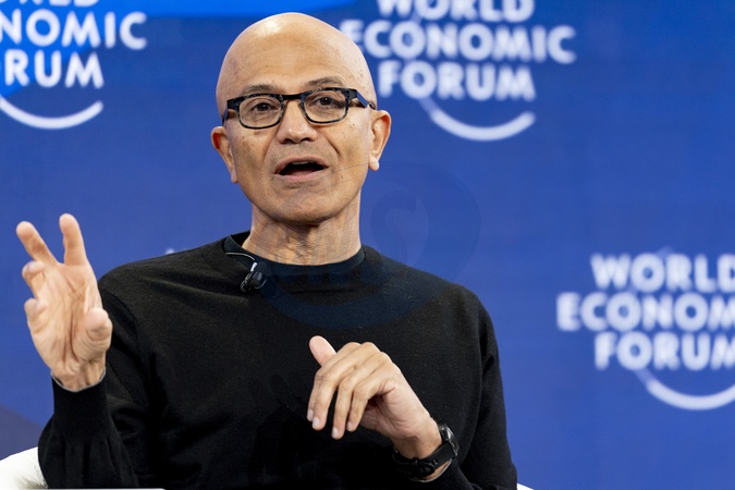 Conversation with Satya Nadella, CEO of Microsoft session with Laurence Fink, Chair and CEO, BlackRock; Interim Co-Chair, World Economic Forum, BlackRock, USA; Satya Nadella; at the World Economic Forum Annual Meeting 2026 in Davos-Klosters, Switzerland, on 20/1/2026, Credit:World Economic Forum / Avalon