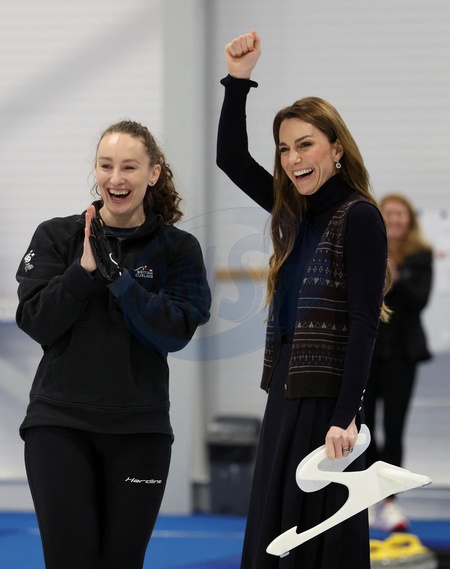 Britain's Kate, Princess of Wales reacts next to Scottish curler Jen Dodds while participating in curling as she meets with the Team GB and Paralympics GB Curling teams ahead of the Winter Olympic Games at the National Curling Academy in Stirling, Scotland, Britain, January 20, 2026., Credit:Russell Cheyne / Avalon