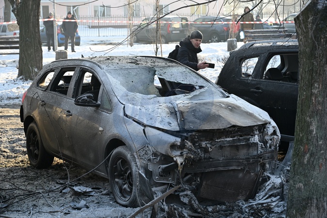 A man looks at the cars hit by falling debris from a Russian strike drone in the Dniprovskyi district of Kyiv, Ukraine, on January 20, 2026. The massive Russian missile and drone attack damaged non-residential buildings, cut power to water supply infrastructure facilities, and left 5,635 multi-storey residential buildings without heating, Credit:Yevhen Kotenko / Avalon