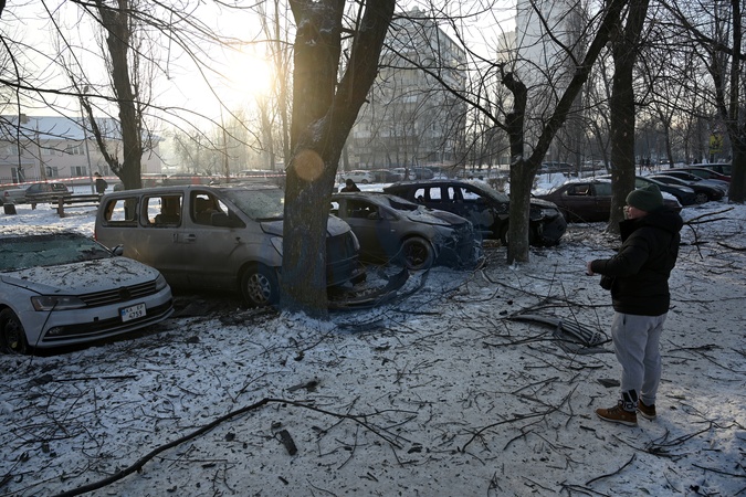 Men look at the cars hit by falling debris from a Russian strike drone in the Dniprovskyi district of Kyiv, Ukraine, on January 20, 2026. The massive Russian missile and drone attack damaged non-residential buildings, cut power to water supply infrastructure facilities, and left 5,635 multi-storey residential buildings without heating, Credit:Yevhen Kotenko / Avalon