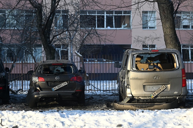 Damaged cars are seen outside a primary school building damaged as a result of falling debris from a Russian strike drone in the Dniprovskyi district of Kyiv, Ukraine, on January 20, 2026. The massive Russian missile and drone attack damaged non-residential buildings, cut power to water supply infrastructure facilities, and left 5,635 multi-storey residential buildings without heating, Credit:Yevhen Kotenko / Avalon