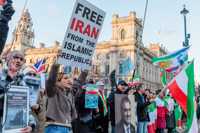 Parliament Square, London, UK. 20th January 2026.Activists and members of the Iranian community in London protest opposite the Houses of Parliament, demanding that the UK government place the Islamic Revolutionary Guard Corps (IRGC) on Britain's terrorist list with chants including 'UK Government, stop supporting terrorists!' and 'IRGC Terrorists, UK put them on the list!", Credit:Photo by Amanda Rose / Avalon