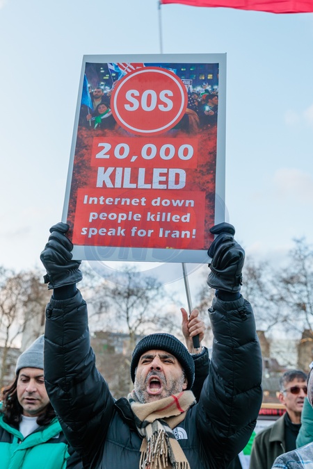 Parliament Square, London, UK. 20th January 2026.Activists and members of the Iranian community in London protest opposite the Houses of Parliament, demanding that the UK government place the Islamic Revolutionary Guard Corps (IRGC) on Britain's terrorist list with chants including 'UK Government, stop supporting terrorists!' and 'IRGC Terrorists, UK put them on the list!", Credit:Photo by Amanda Rose / Avalon