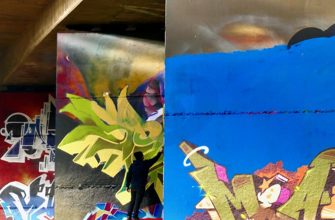 The recent colourful artworks on the underside of the viaduct. The Loddon Viaduct is a place where graffiti artists come to display their talents, with ever changing artworks on the underpass to brighten up commuters and walkers days with the vibrant displays, one often being covered by another within days. The work can be seen from the River Thames, the link road and the showcase cinema complex., Credit:Geoffrey Swaine / Avalon