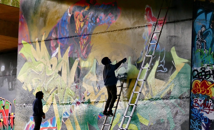 Artists paint a mural on the wall. The recent colourful artworks on the underside of the viaduct. The Loddon Viaduct is a place where graffiti artists come to display their talents, with ever changing artworks on the underpass to brighten up commuters and walkers days with the vibrant displays, one often being covered by another within days. The work can be seen from the River Thames, the link road and the showcase cinema complex., Credit:Geoffrey Swaine / Avalon