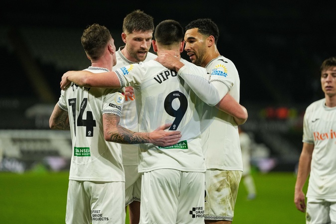 Žan Vipotnik of Swansea City celebrates scoring a goal with his teammates during the Sky Bet Championship match Swansea City vs Blackburn Rovers at Swansea.com Stadium, Swansea, United Kingdom, 20th January 2026, Credit:Andrew Lewis/News Images / Avalon
