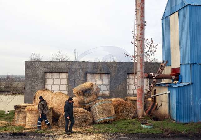 Men stand next to straw bales used for heating at one of the schools in the Marazliivka territorial community, Odesa region, Ukraine, on January 19, 2026. Due to prolonged electricity outages and heating disruptions resulting from Russian missile and drone attacks on Ukraine's energy infrastructure, schools in the region are switching to straw heating, Credit:Nina Liashonok / Avalon