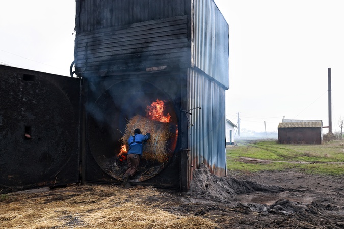 A man loads a bale of straw into a boiler on the premises of a school in the Marazliivka territorial community, Odesa region, Ukraine, on January 19, 2026. Due to prolonged electricity outages and heating disruptions resulting from Russian missile and drone attacks on Ukraine's energy infrastructure, schools in the region are switching to straw heating, Credit:Nina Liashonok / Avalon