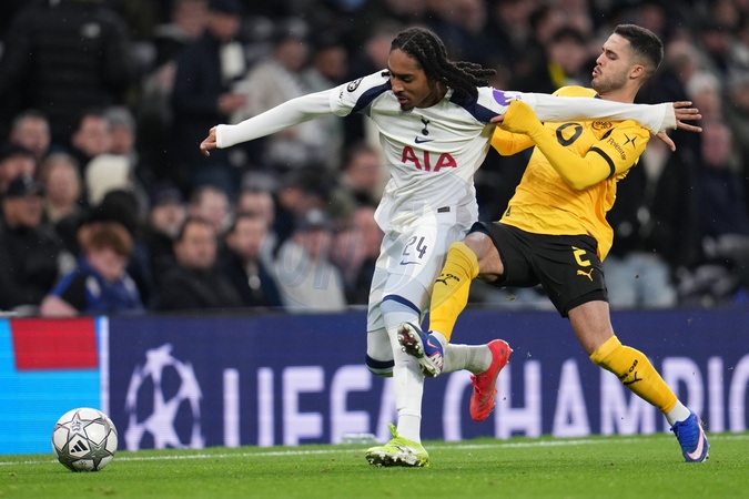 Djed Spence of Tottenham Hotspur holds off Yan Couto of Borussia Dortmund during the UEFA Champions league Matchday 7 of 8 Tottenham Hotspur vs Borussia Dortmund at Tottenham Hotspur Stadium, London, United Kingdom, 20th January 2026, Credit:Harvey Murphy/News Images / Avalon