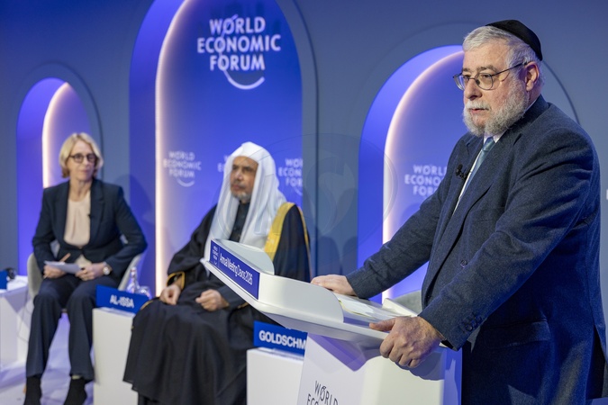 Advancing Interfaith Dialogue for Peace session with Pinchas Goldschmidt, Chief Rabbi and President, Conference of European Rabbis and Mohammed Al-Issa, Secretary-General, Muslim World League (MWL), Saudi Arabia at the World Economic Forum Annual Meeting 2026 in Davos-Klosters, Switzerland, on 21 January 2026 from 09:00 to 09:30 in the Congress Centre – Spotlight (Zone B), Issue Briefing., Credit:Benedikt von Loebell / Avalon