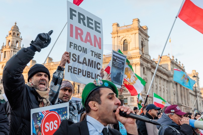 Parliament Square, London, UK. 20th January 2026.Ahead of tomorrow's PMQ, (Prime Ministers Questions), activists and members of the Iranian community in London protest opposite the Houses of Parliament, demanding that the UK government place the Islamic Revolutionary Guard Corps (IRGC) on Britain's terrorist list with chants including 'UK Government, stop supporting terrorists!' and 'IRGC Terrorists, UK put them on the list!", Credit:Photo by Amanda Rose / Avalon