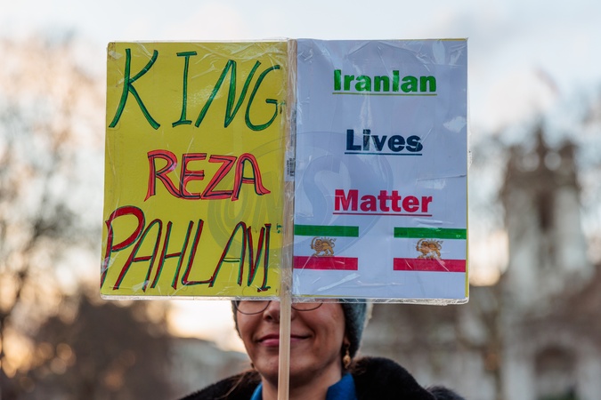 Parliament Square, London, UK. 20th January 2026.Pro Monarchy Iranian holds a sign in support of exiled Crown Prince Reza Pahlavi outside the Houses of Parliament in London.Iranians in the diaspora continue to support the activists in Iran, calling for an end to the Islamic Regime and return of the Pahlavi Monarchy.Activists and members of the Iranian community in London protest opposite the Houses of Parliament, demanding that the UK government place the Islamic Revolutionary Guard Corps (IRGC) on Britain's terrorist list., Credit:Photo by Amanda Rose / Avalon