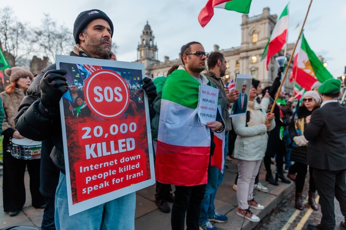 Parliament Square, London, UK. 20th January 2026.Ahead of tomorrow's PMQ, (Prime Ministers Questions), activists and members of the Iranian community in London protest opposite the Houses of Parliament, demanding that the UK government place the Islamic Revolutionary Guard Corps (IRGC) on Britain's terrorist list with chants including 'UK Government, stop supporting terrorists!' and 'IRGC Terrorists, UK put them on the list!", Credit:Photo by Amanda Rose / Avalon