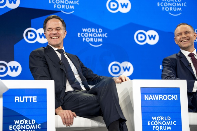 Can Europe Defend Itself? session with Alexander Stubb, President of Finland; Karol Nawrocki, President of Poland; Mark Rutte, Secretary-General, North Atlantic Treaty Organization (NATO), Brussels; Nadia Calviño, President, European Investment Bank, Luxembourg; Paul Hudson, Chief Executive Officer, Sanofi, France; Sarah Kelly, Anchor-at-Large, Deutsche Welle, USA; at the World Economic Forum Annual Meeting 2026 in Davos-Klosters, Switzerland, on 21 January 2026 from 10:15 to 11:00 in the Congress Centre – Sanada (Zone E), Stakeholder Dialogue. 2026 World Economic Forum. Copyright: World Economic Forum/Valeriano Di Domenico, Credit:VALERIANO DI DOMENICO / Avalon