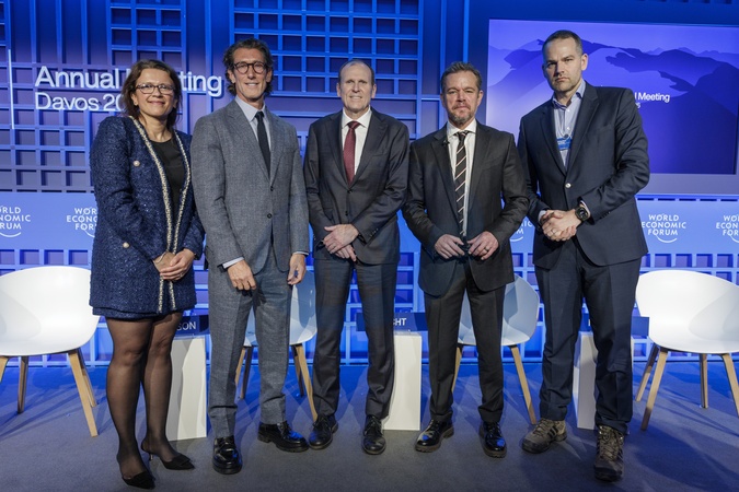 Water in the Balance session with Aulani Wilhelm, Chief Executive Officer, Nia Tero, USA; Haslinda Amin, TV Anchor and Editor-at-Large, Bloomberg News, Singapore; Jennifer Morris, Chief Executive Officer, Nature Conservancy, USA; Kris Licht, Chief Executive Officer, Reckitt Benckiser, United Kingdom; Matt Damon, Co-Founder, Water.org, USA; Richard Dickson, President and Chief Executive Officer, Gap Inc., USA; at the World Economic Forum Annual Meeting 2026 in Davos-Klosters, Switzerland, on 21 January 2026 from 10:15 to 11:00 in the Kurpark Village – Aspen 4 (Zone K), Stakeholder Dialogue., Credit:Avalon