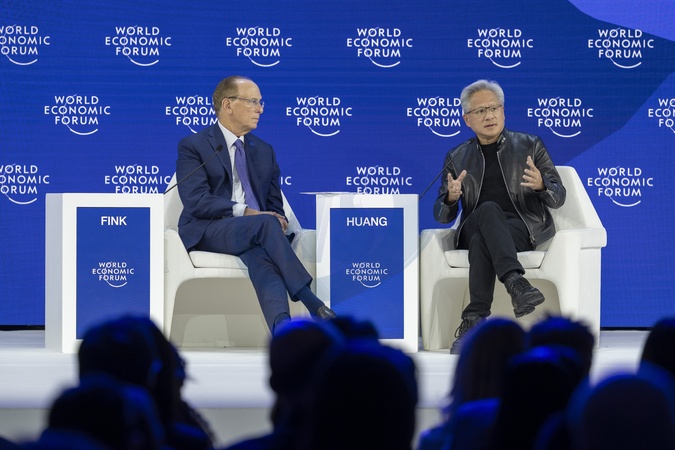 Conversation with Jensen Huang, President and CEO of NVIDIA session with Jensen Huang, Founder, President and Chief Executive Officer, NVIDIA, USA; Laurence Fink, Chair and CEO, BlackRock; Interim Co-Chair, World Economic Forum, BlackRock, USA; at the World Economic Forum Annual Meeting 2026 in Davos-Klosters, Switzerland, on 21 January 2026 from 11:30 to 12:00 in the Congress Centre – Congress Hall (Zone C), One-on-One., Credit:Avalon