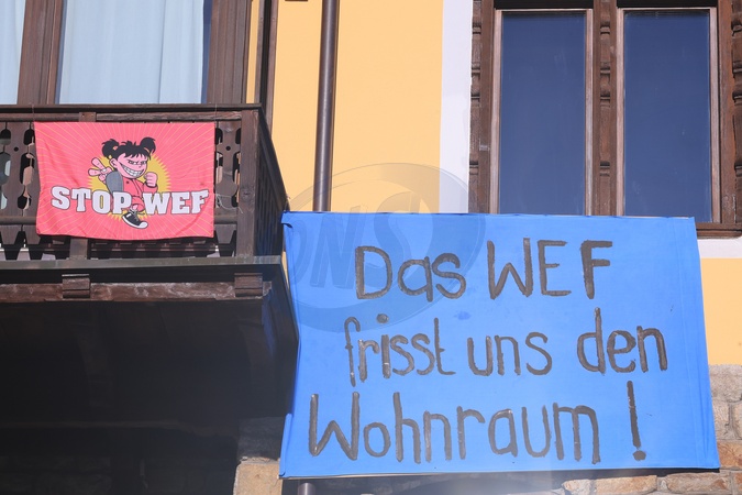 January 21, 2026, Davos. DAVOS - World Economic Forum (WEF). In the photo, residents display a Stop Davos sign..., Credit:Pierre Teyssot / Avalon