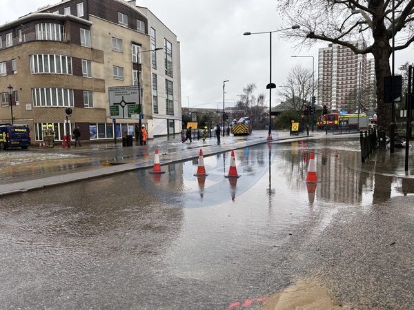 Flooding and emergency response closes roads at Shepherd’s Bush roundabout, London
