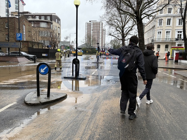 Pedestrians cross flooded road during emergency response in Shepherd’s Bush, London