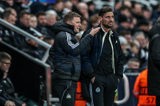 Eddie Howe manager of Newcastle United gives instructions to Jason Tindall assistant manager of Newcastle United during the UEFA Champions League Matchday 7 of 8 Newcastle United v PSV Eindhovenn at St. James's Park, Newcastle, United Kingdom, 21st January 2026, Credit:Mark Cosgrove/News Images / Avalon