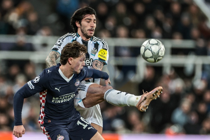 Paul Wanner of PSV Eindhoven and Sandro Tonali of Newcastle Untied battle for the ball during the UEFA Champions League Matchday 7 of 8 Newcastle United v PSV Eindhovenn at St. James's Park, Newcastle, United Kingdom, 21st January 2026, Credit:Mark Cosgrove/News Images / Avalon